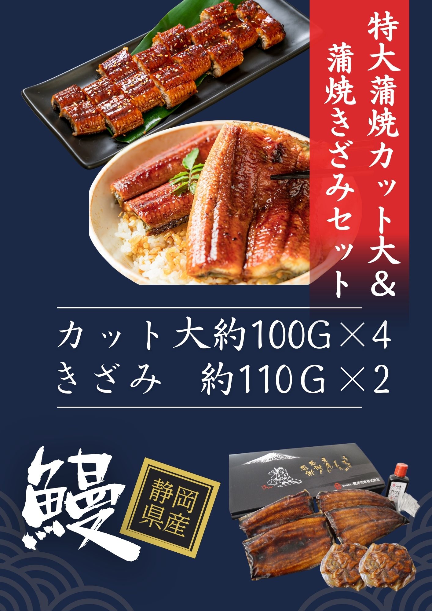 1/2カットの特大蒲焼き4つと、人気の蒲焼きざみ2パックがセットになりました!